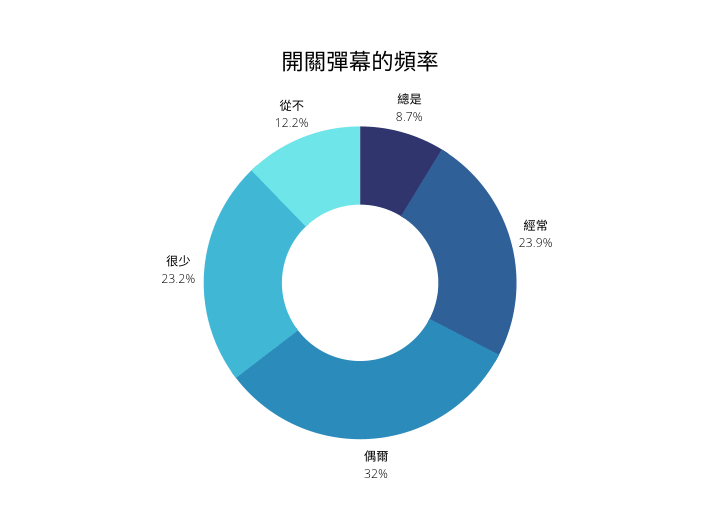 在「開彈幕頻率」和「不開原因」的交叉比對中,選擇「不想看到意見不合彈幕」的人最不常開,平均頻率為2.4,比總平均的2.9低了0.5;選擇「作品調性不合彈幕屬性」的人是最常開的,以3分略高於總平均,我們推測勾選此選項的人,可能觀賞他們認為調性不合的作品時暫時關閉此功能,但很多時候仍會開著。