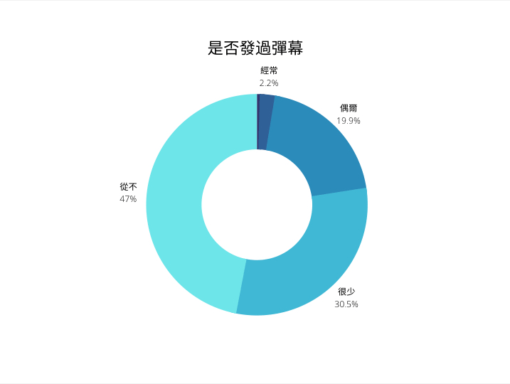在「是否發過彈幕」的問題中,回答「從不」的人最多,佔了46.9%(205人),「很少」佔了30.4%(133人)、「偶爾」佔了19.9%(87人);較少的是回答「經常」者,佔2.2%(10人),最少的為回答「總是」者,僅佔0.4%(2人)。(見圖五)