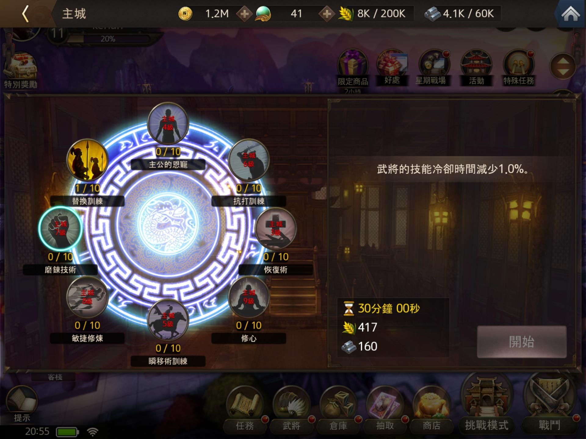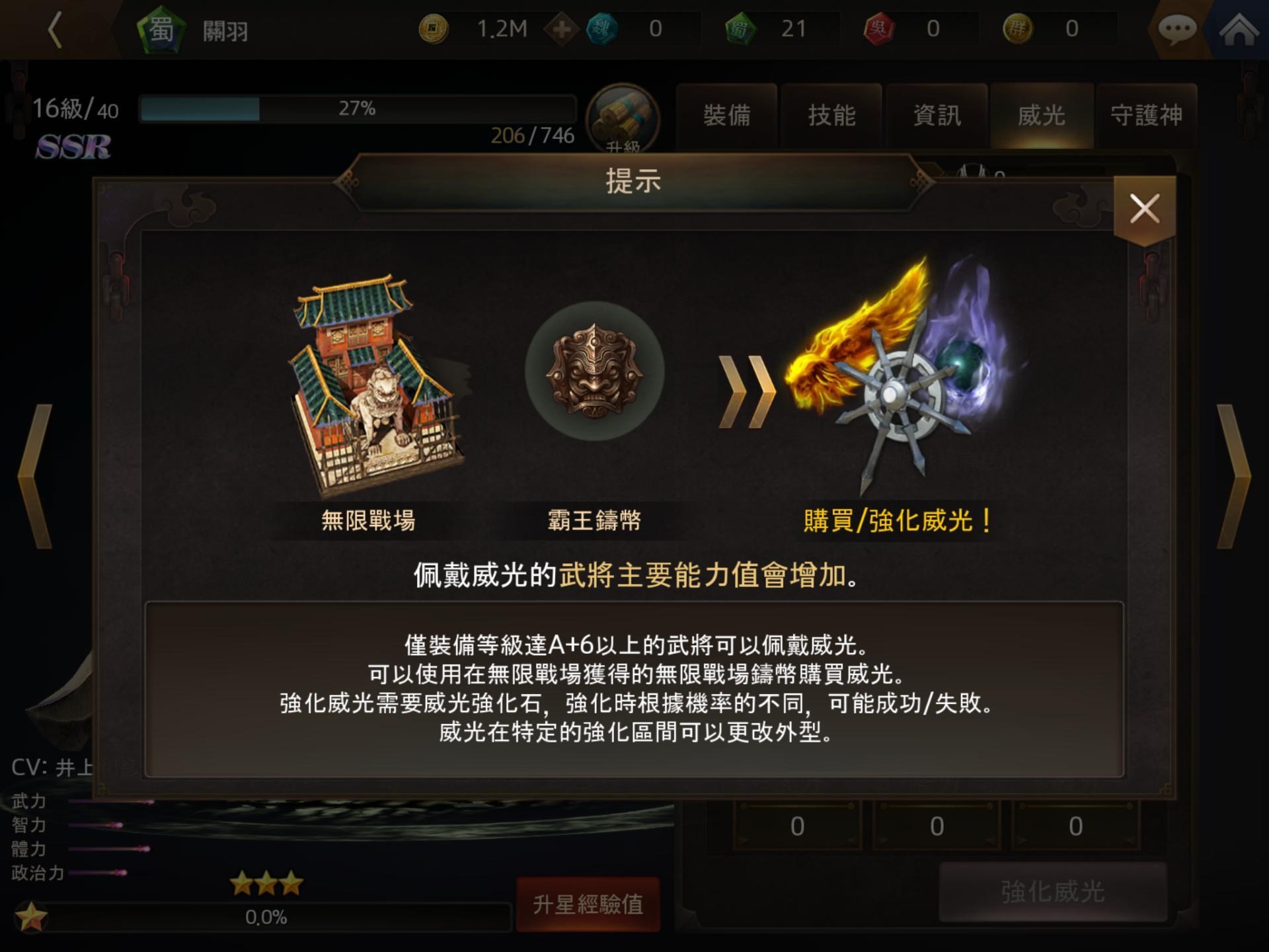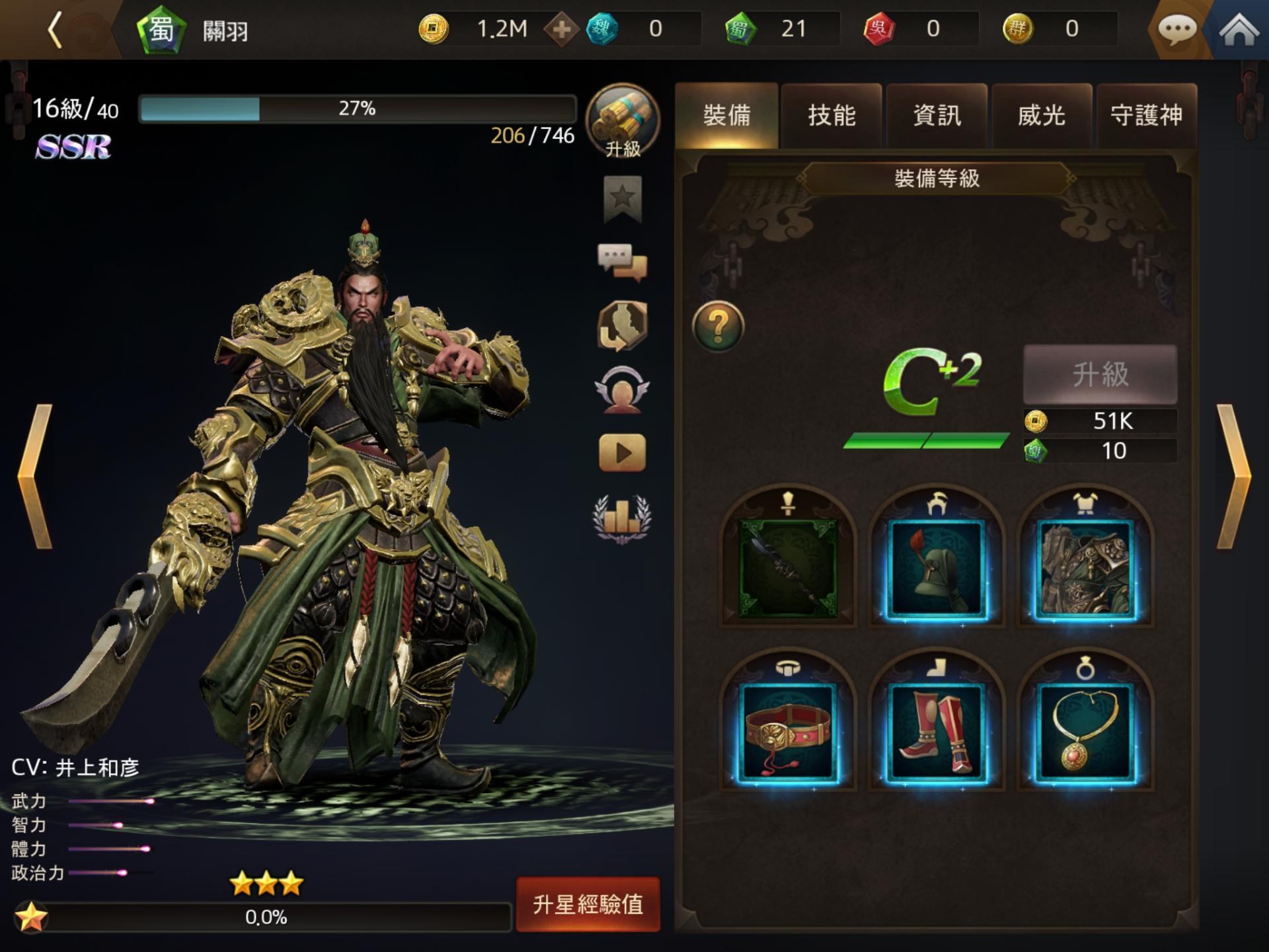 武將可以透過培育有進一步的成長,培育系統除了常見的裝備、技能和升星投資外,還能透過威光和守護神增加素質,這些都可以自由選擇投資。武將還有影響隊伍的被動技,以及特定名將上陣觸發的組隊效果,再加上關卡挑戰的條件選擇,在培育投資和上陣武將時都有更多的考量。有些將領還有特殊單挑技能,會依情況觸發,可以在編隊時加入考量。