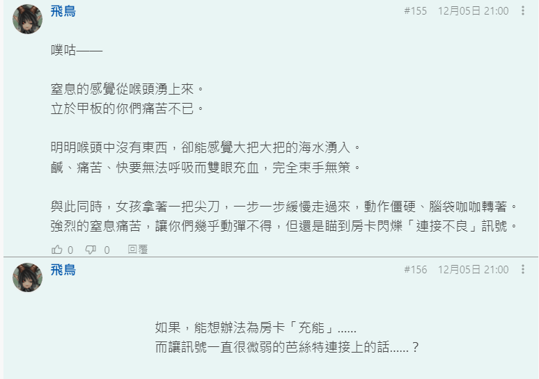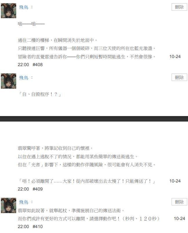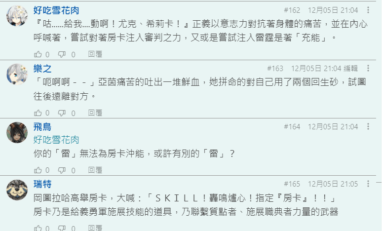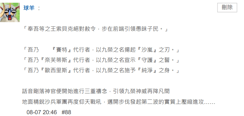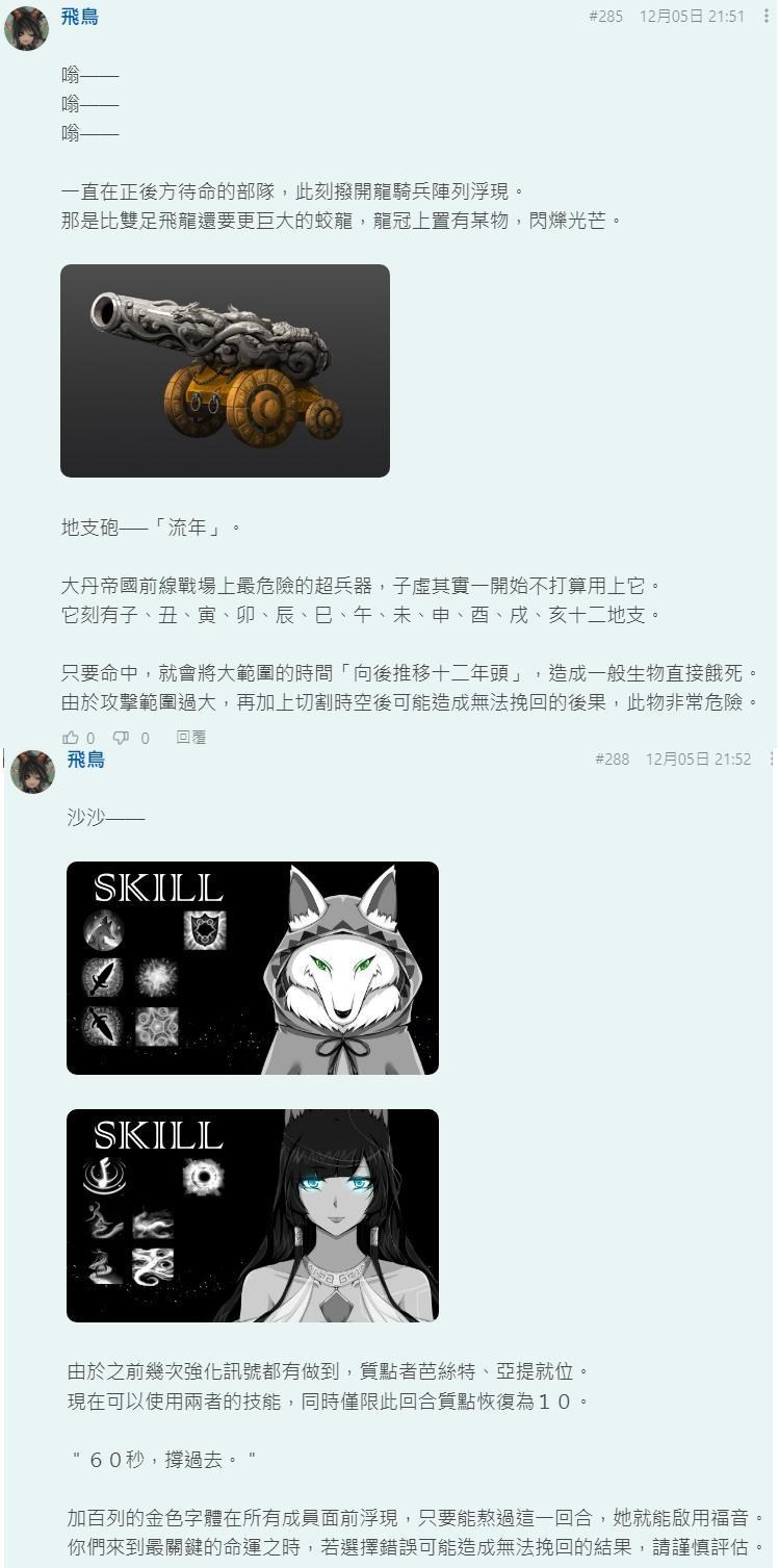 另外我也不會在後方串撰寫任何東西,畢竟我是把劇本當成小說在進行,因此我寫的描述不管是誰來看都能夠看得懂,不需要特別去後方觀看能力說明,這也是一個好的小說的重要條件:讀者都看不懂小說了,要怎麼享受故事呢?