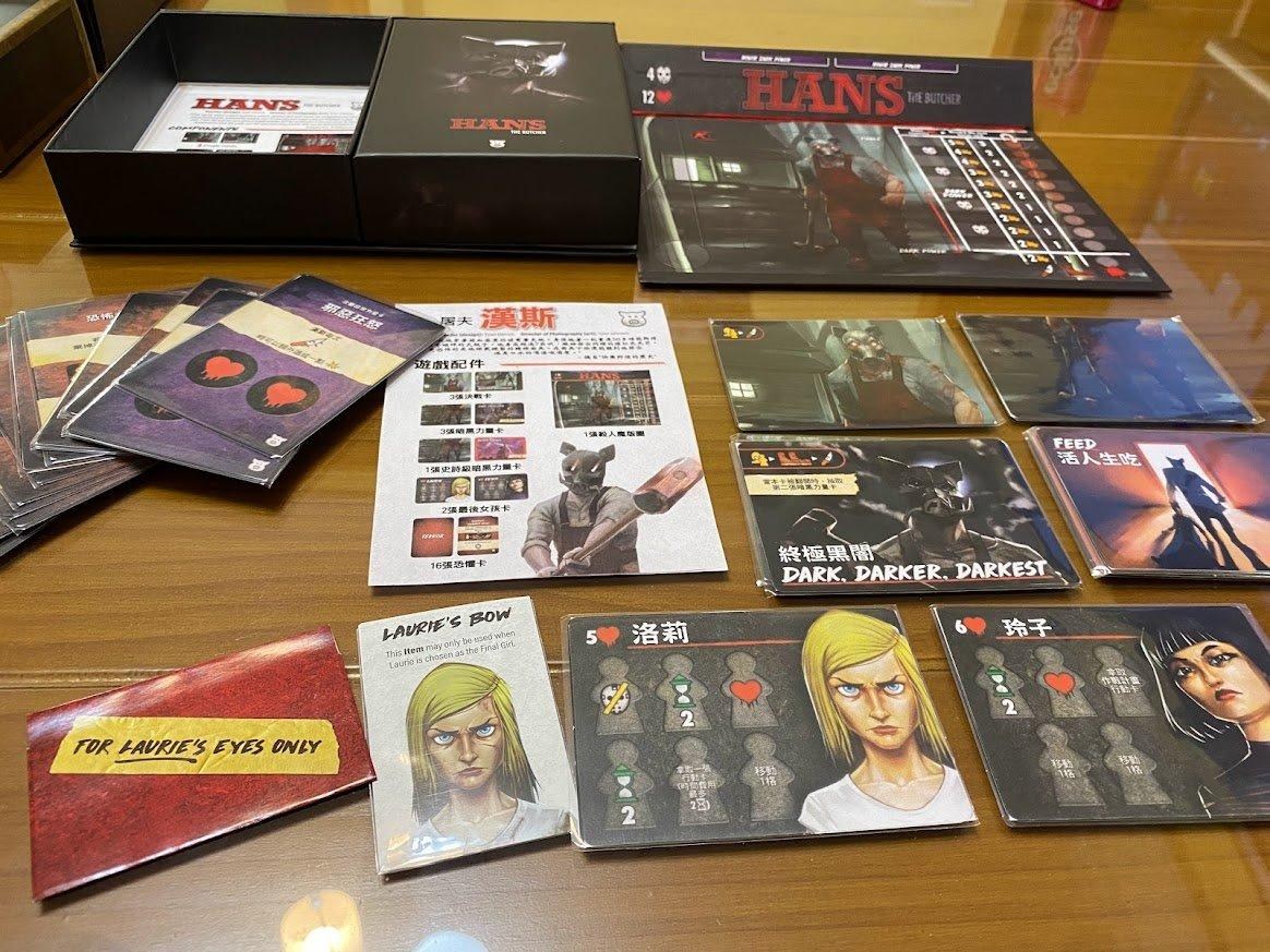 一個劇情盒一邊是殺人魔,其中包含規則、女孩卡、暗黑力量卡、決戰卡