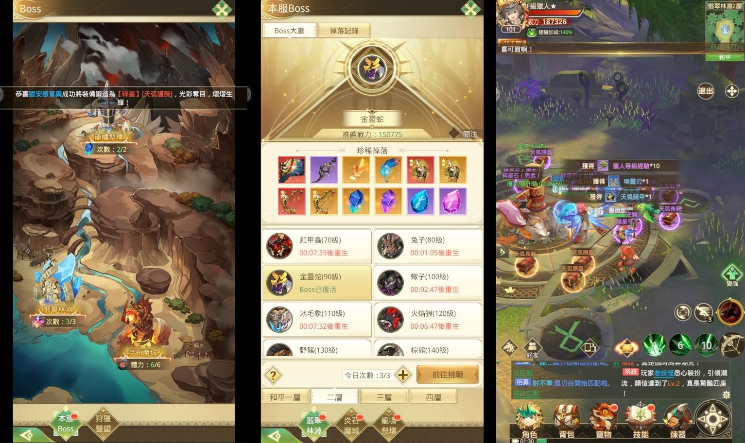 遊戲的打王系統也是滿輕鬆的,狩獵BOSS分為了翡翠林淵、炎石魔城、龍嘯祭壇三種,翡翠林淵可以獲得裝備、翅膀、套裝石,炎石魔城可以獲得裝備、精靈、寵物召喚券、星狩幣,龍嘯祭壇可以獲得翅膀、裝備、套裝石、魂石,三者差別在於,前兩個是可以進行PVP的地圖,所以建議組隊前往挑戰,而龍嘯祭壇則是個人挑戰,不會有人跟你搶。