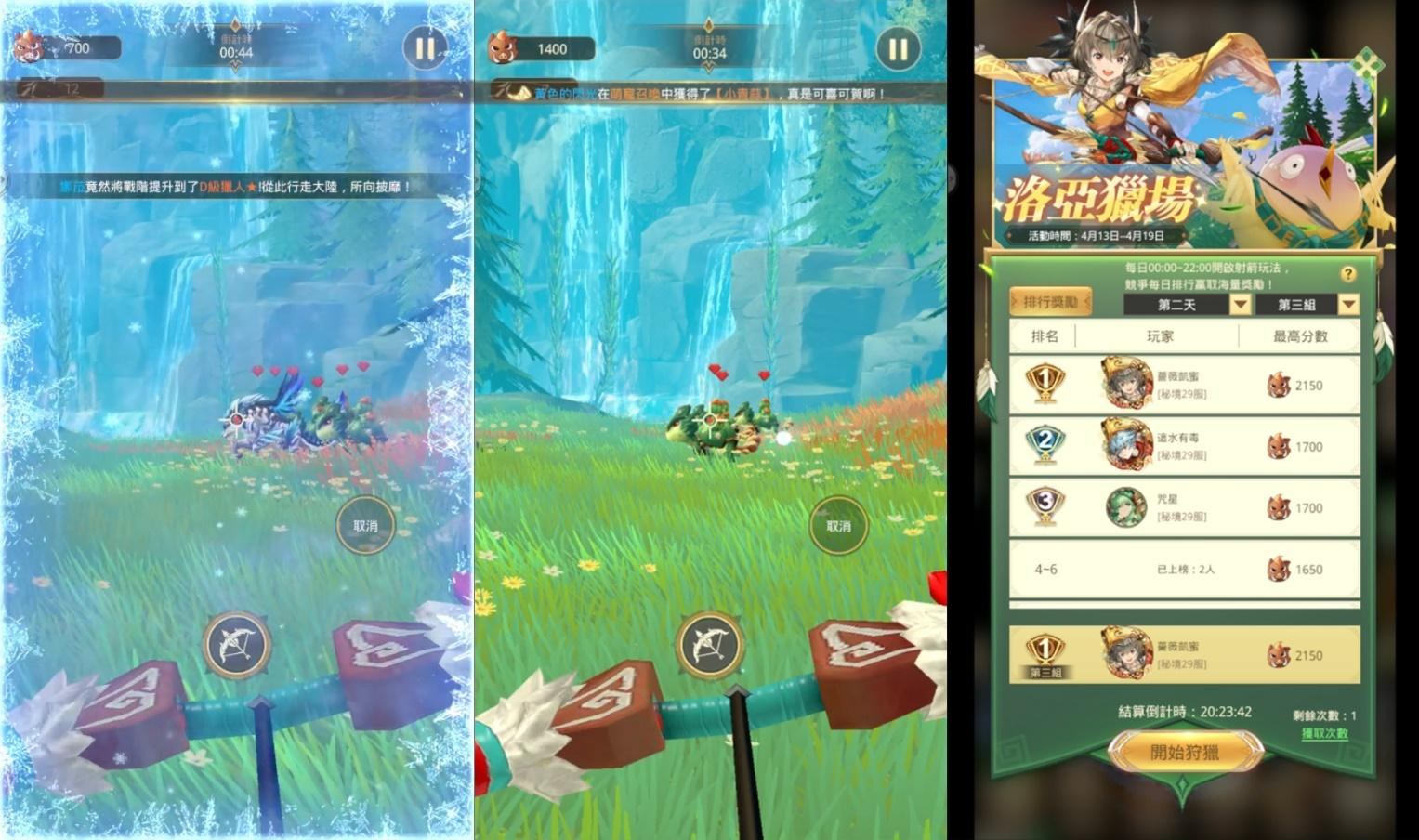 最後分享開服活動「洛亞獵場」,這個活動只有開服七天,每天可以透過活躍度獎勵獲得兩次射箭次數,進入之後要利用手上的弓箭來獵殺寵物,寵物頭上幾顆愛心就需要命中幾次才能成功狩獵,最後會根據狩獵的分數來排行,這個小遊戲還滿好玩的,盡量瞄準2心以上的分數就會比較高,可以拿到更好的排名獎勵。