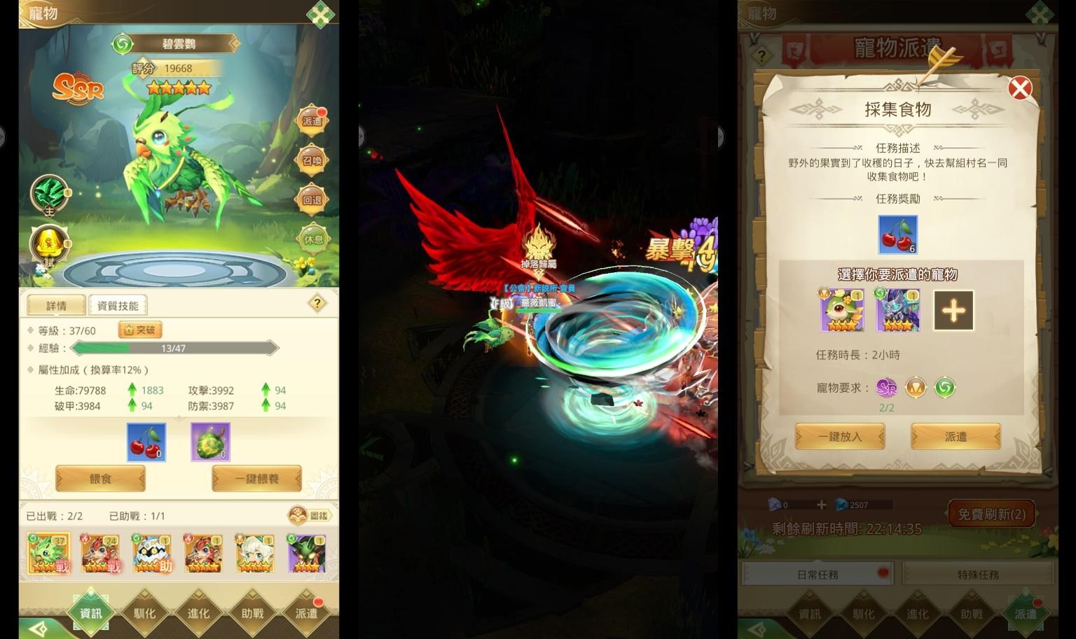 這款的寵物系統比較有趣一點,一次可以出戰兩個寵物,遊戲目前開放了26種不同的寵物,每一隻的技能跟攻擊方式都不同,所以搭配出各種不同的組合,像是碧雲鸚的持續暈眩配上多蘿象的持續傷害。另外寵物還可以派遣出去執行任務,可以獲得各種寵物提升需要的素材,有種讓寵物自己打工養自己的感覺。