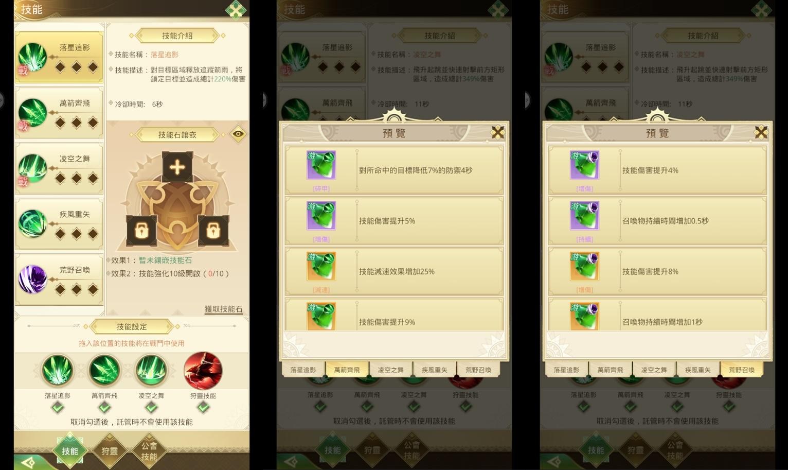 每個職業都擁有五招基本技能,同時只能裝備3招技能,但可以在戰鬥過程中隨時調整技能的選擇,第四招為狩靈技能,需要透過遊戲各種管道獲得狩靈後才能使用專屬技能,當角色達到100等以上就會解鎖技能強化效果,可以鑲嵌自己想要的技能石。