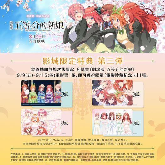 《劇場版 五等分的新娘》影城特典第三彈 電影珍藏紀念卡公開同標籤作品搜尋:五等分的新娘 劇場版|「東立」|「講談社」|《週刊少年Magazine》|電影|動畫電影2022|春場蔥|車庫娛樂|五等分的新娘