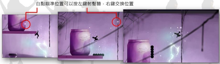 玩家擁有唯一的能力便是使用繫在頭上的髮簪移動,髮簪和人偶是靈物一體,髮簪所及之處便是玩家身處之處,玩家能透過髮簪的「傳送」快速穿梭到該位置,輕巧的踏越在屋中的各種物件上,甚至能交換活體物件的位置。在遇上怪物時,除了能使用髮簪連續傳送衝刺,逃離危險,更能利用髮簪傳送的能力,製造陷阱,反殺怪物。