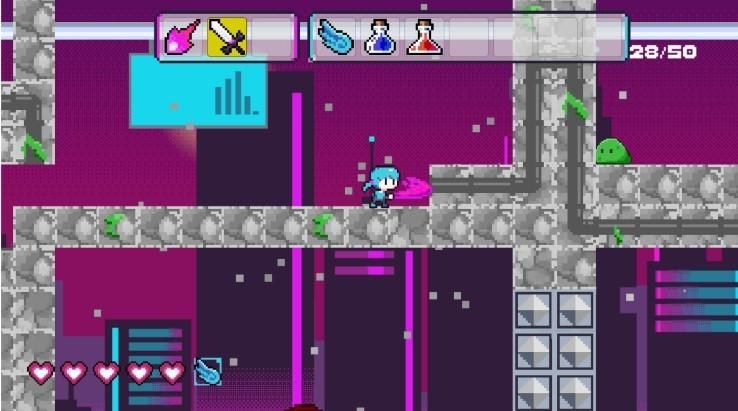 遊戲特色-獨創背包系統,玩家須在背包空間限制下突破關卡 (右下角顯示重量與限制) 背包的重量會影響玩家關卡的進行,紫色框為武器背包,可以存放收集到的武器,用滑鼠滾輪可以切換現在使用的武器。藍色框為道具背包,可以存放收集到的道具,用滑鼠滾輪可以切換選擇的道具,幫助玩家突破難關。