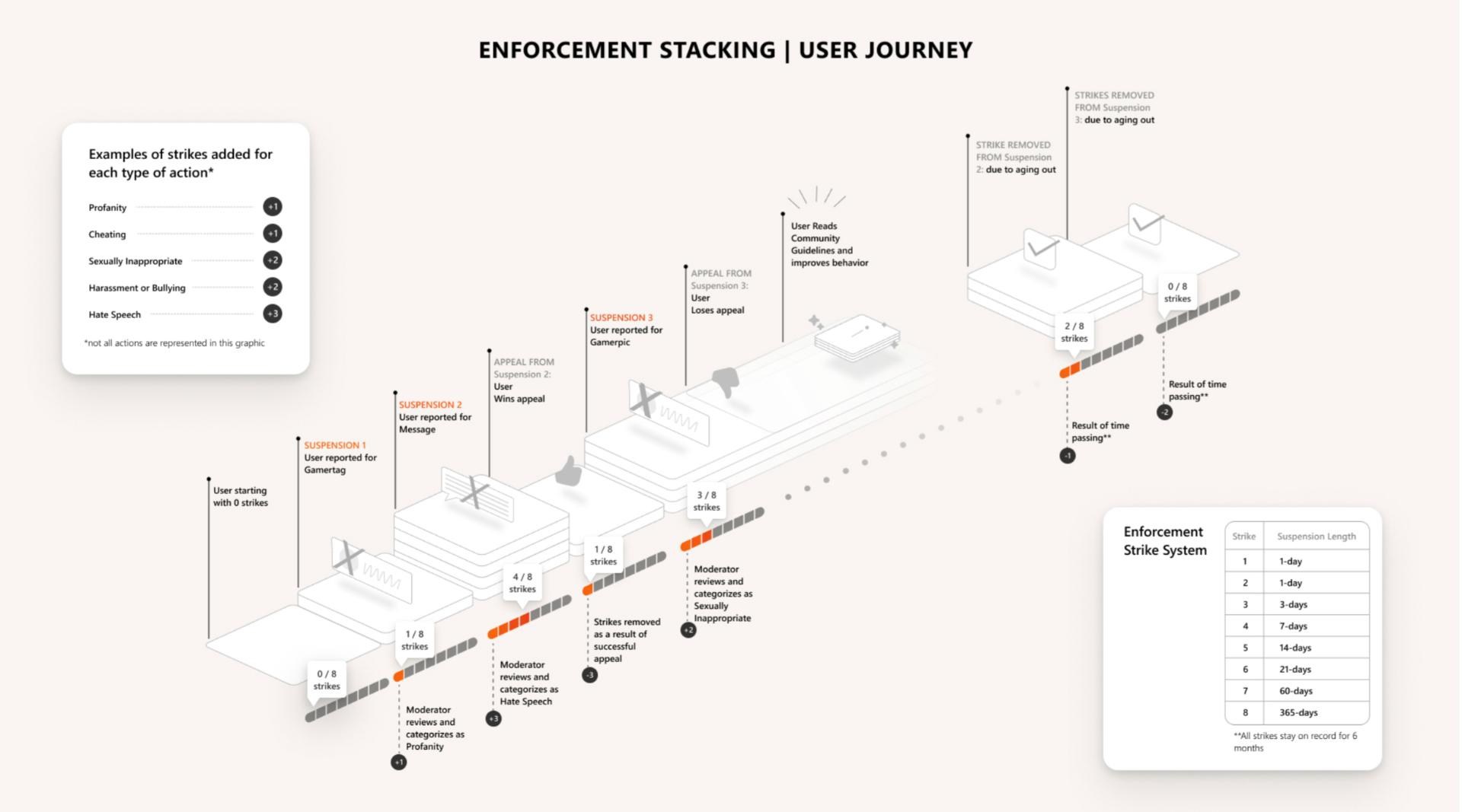 XBox 剛宣佈會執行全新的社交保護功能,一旦玩家被舉報及證實作出不當行為,將會按照行為嚴重性給予相應的分數,例如作弊為1分而憎恨性言論為3分。