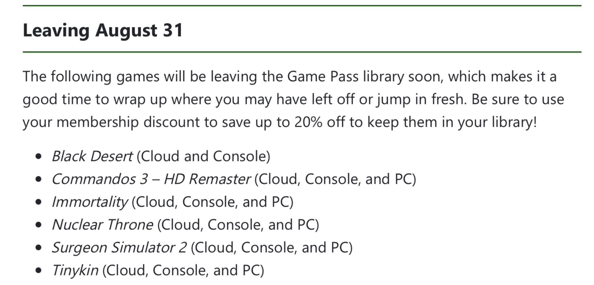 這期離開陣容中,比較意外的是黑沙作為推出了相當多時日的MMORPG,竟然會落架而不是繼續在Game Pass 中吸納玩家呢,雖然上了很長時間就是。