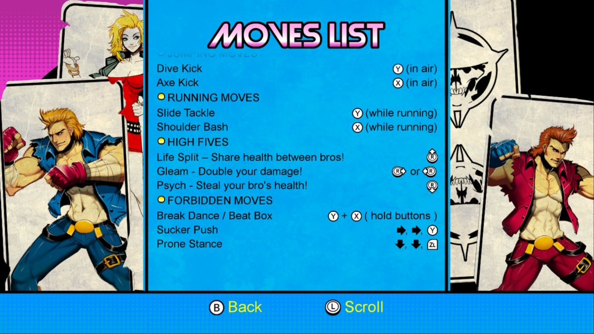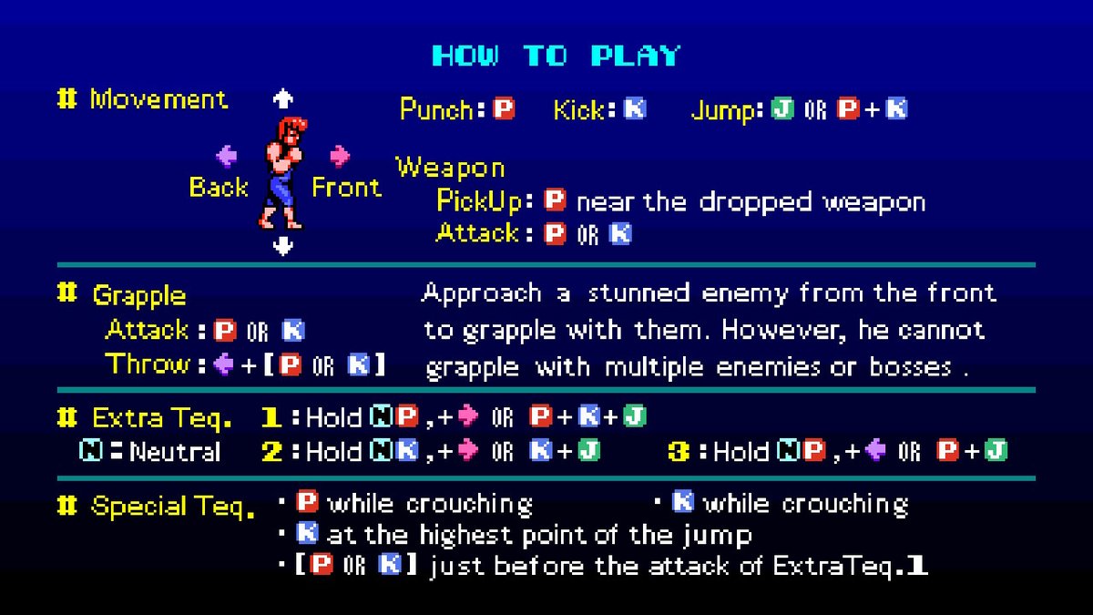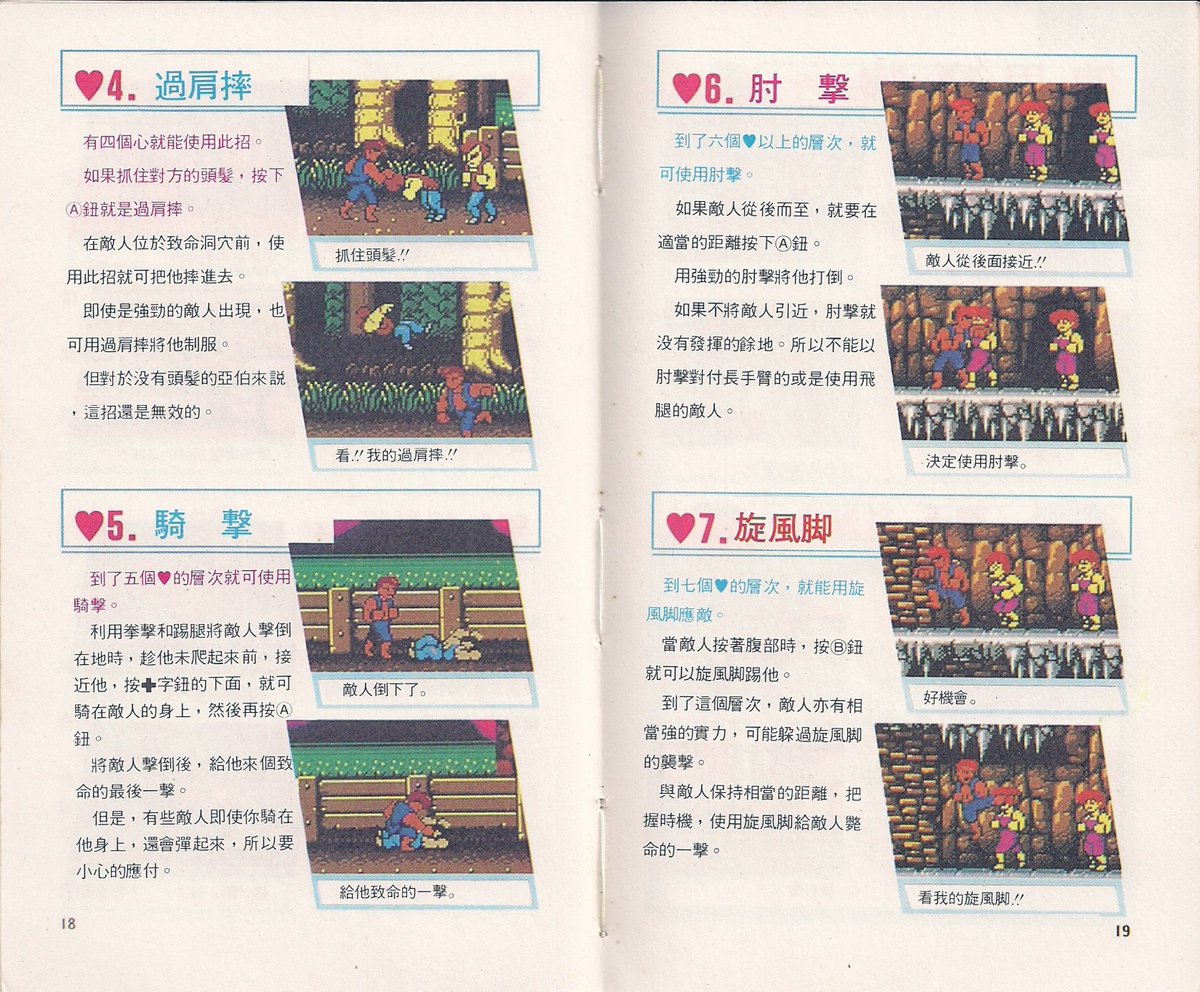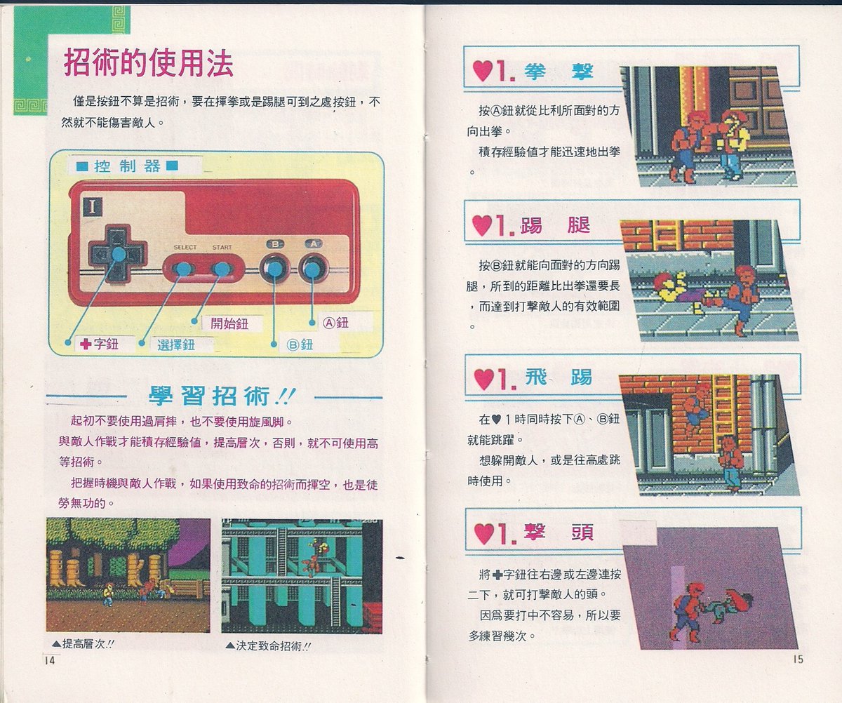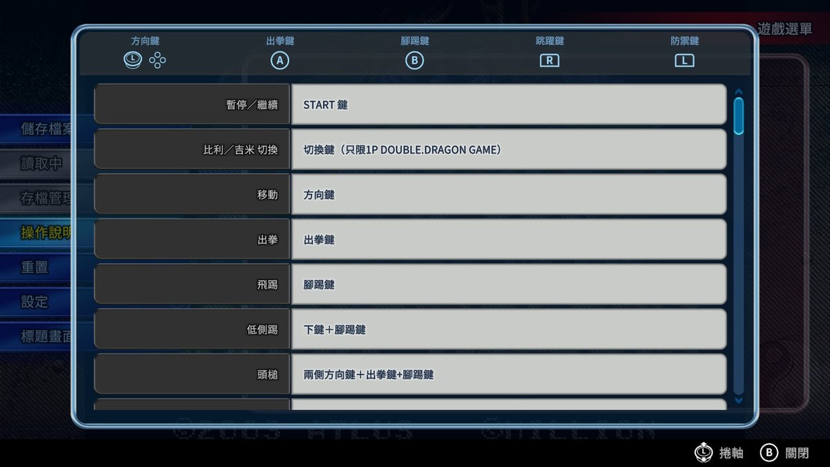 【SFC超級雙截龍操作方式介紹】◆十字方向鍵:在場景裡移動人物,可以邊蓄力邊移動,還可以控制跳躍方向與攻擊方向。在遊戲標題畫面的OPTION界面裡用來在各個選項裡定位與切換。◆A鍵:踢腿。當敵人被打得麻痺硬直時,可以一腳吹飛敵人。抓住敵人可以配合方向鍵左與右踢自己身後的敵人。在遊戲標題畫面的OPTION界面裡作用是確定鍵。◆B鍵:格擋。可以格擋敵人的空中飛腳攻擊與地面滑鏟攻擊。如果敵人站在地面出拳打主角,主角可以格擋擒臂,抓住敵人手臂後揮拳或掄腳連續打擊最多四段,第四段吹飛。也可以選擇不吹飛,按X鍵把敵人扔到自己身後。◆X鍵:跳躍。可以配合方向鍵左與右形成斜跳與空中後踢。◆Y鍵:揮拳。當敵人被打得麻痺硬直時,可以一拳吹飛敵人,距離不同,出拳姿勢不同。◆L鍵或R鍵:按住不動可以為氣力槽蓄力。蓄力程度處於閉區間(1%,50%)程度時,按Y鍵發動轉身重拳,按A鍵發動轉身飛腳,全都是威力較大但出現攻擊判定較遲的技能,前者一擊打麻敵人,後者吹飛敵人。蓄力程度處於半開半閉區間[50%,100%)程度時,按Y鍵與A鍵都可以發動主角的招牌技能『龍尾嵐風腳』,俗稱旋風腳或者旋風腿。蓄力程度達到100%時,A鍵一腳吹飛敵人,Y鍵一拳吹飛敵人。◆{X鍵+下+B鍵}:下落側踢,攻擊判定持續時間比普通飛腳長,實用價值很高。◆抓住敵人時:無論是擒臂還是抓頭,A鍵腿踢,Y鍵肘擊,累積三段後可以選擇第四段吹飛或者按X鍵扔到身後砸中身後的敵人。在抓住敵人時,主角可以按向後方向與A鍵一腳踹倒身後的敵人。最好不要去抓BOSS,BOSS們掙脫速度很快,甚至反擊,再有,二刀流『ベイカー』、綠衣『ジェフ』、胖子『マクガイア』、墨鏡『カーレム』的攻擊,主角雖然可以格擋,但無法擒臂。◆START開始鍵:遊戲開始,遊戲暫停,遊戲繼續。〓〓〓〓〓〓〓〓〓〓〓〓〓〓〓〓〓〓〓〓〓〓〓〓〓〓〓〓〓〓〓〓〓〓