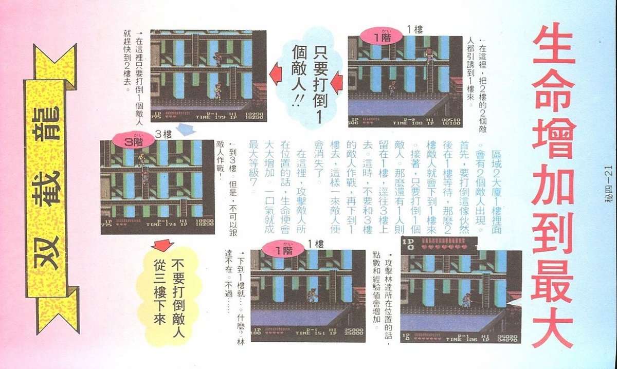 ■快速加心法:在第二關爬上鐵絲網後,殺死一個手持棒球棍的敵人,走到鐵絲網右端盡頭跳下去。略待片刻,有兩名敵人出現。此時轉身走到鐵絲網的底端,當敵人走到鋼板的頂端時,讓主角往網上爬,敵人便會站住不動。爬上鐵絲網,往回走到左端直到沒看到敵人,此時鋼板的頂端的敵人消失了。走到敵人原來站的地方,即鋼板頂端,按【A鍵】或【B鍵】進攻,即可不斷得分。
