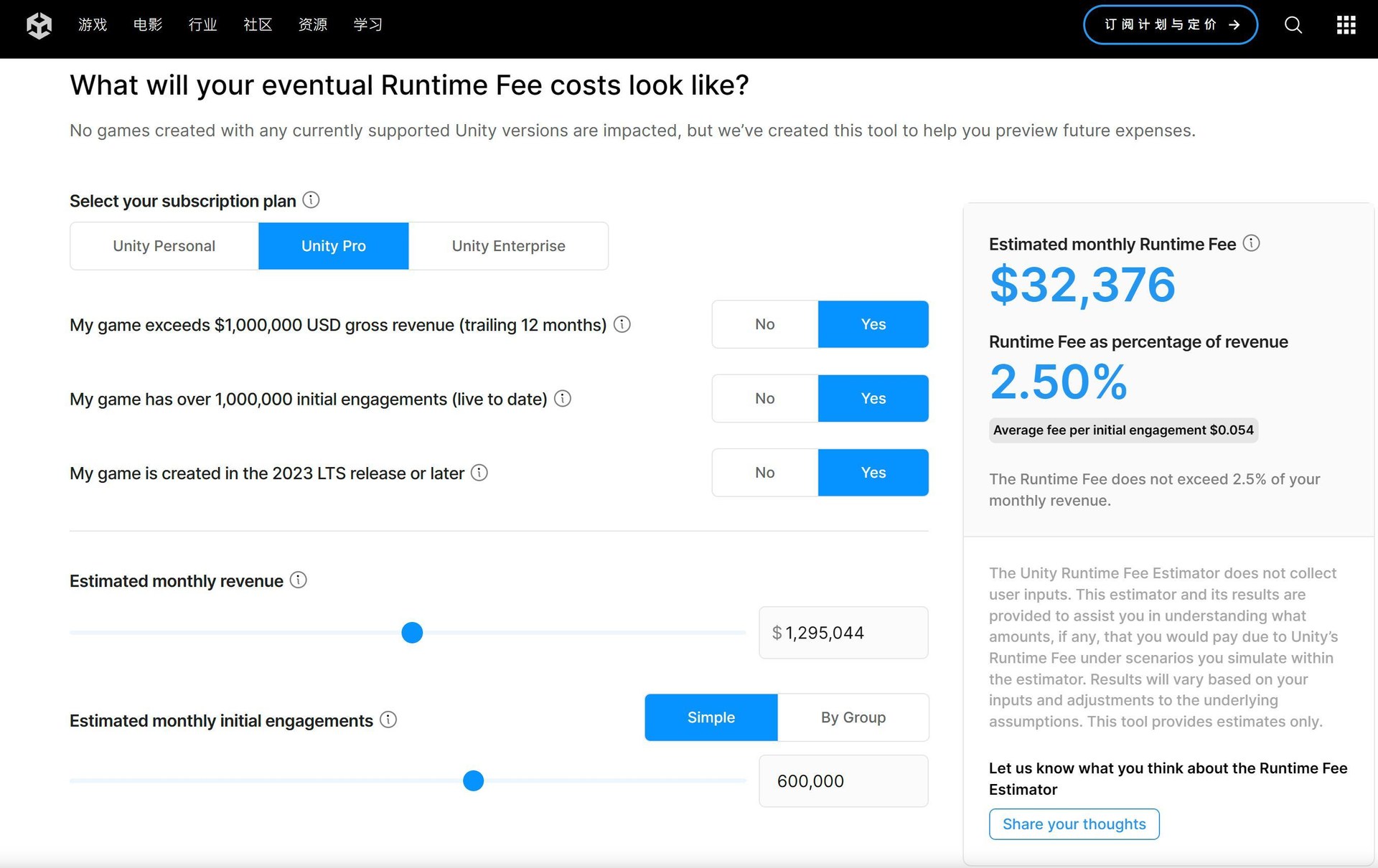 這年遊戲引擎最大的事件,當然是兩大通用遊戲引擎之一的Unity ,宣佈改變收費架構加入Unity Runtime Fee ,過了一定的收入及安裝次數標準後,按安裝次數收費。
