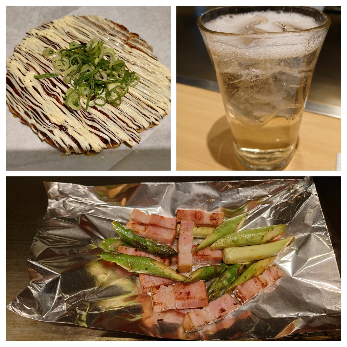 花枝大阪燒(雖然照片看不到花枝)、梅酒、蘆筍跟培根