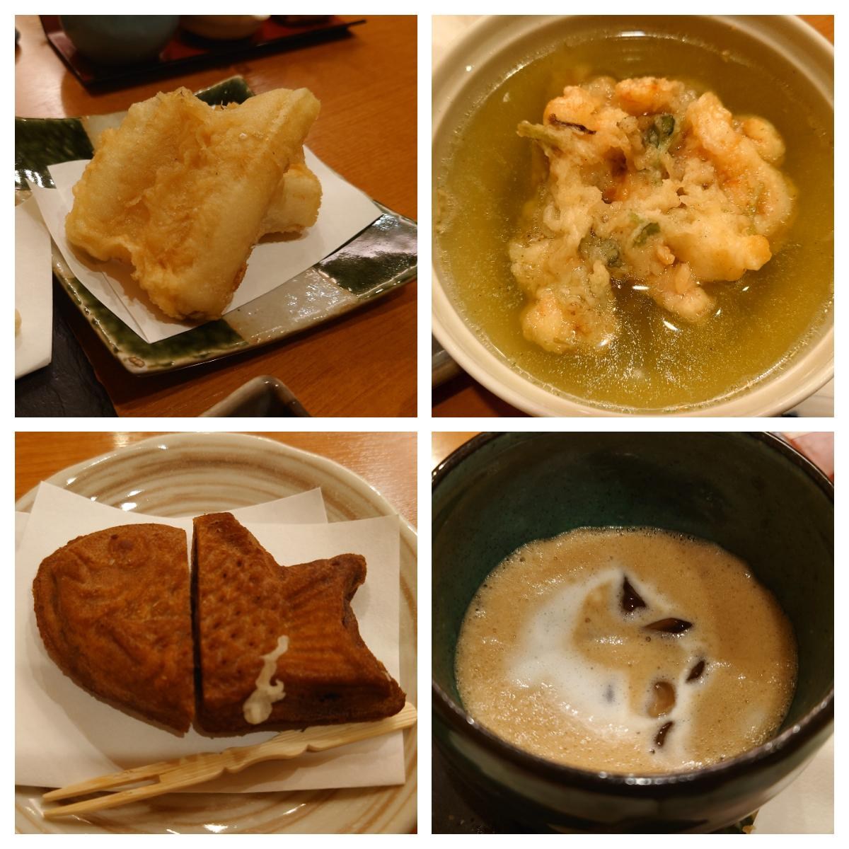 炸魚、茶泡飯(也可以選丼飯)、甜點鯛魚燒、冰咖啡