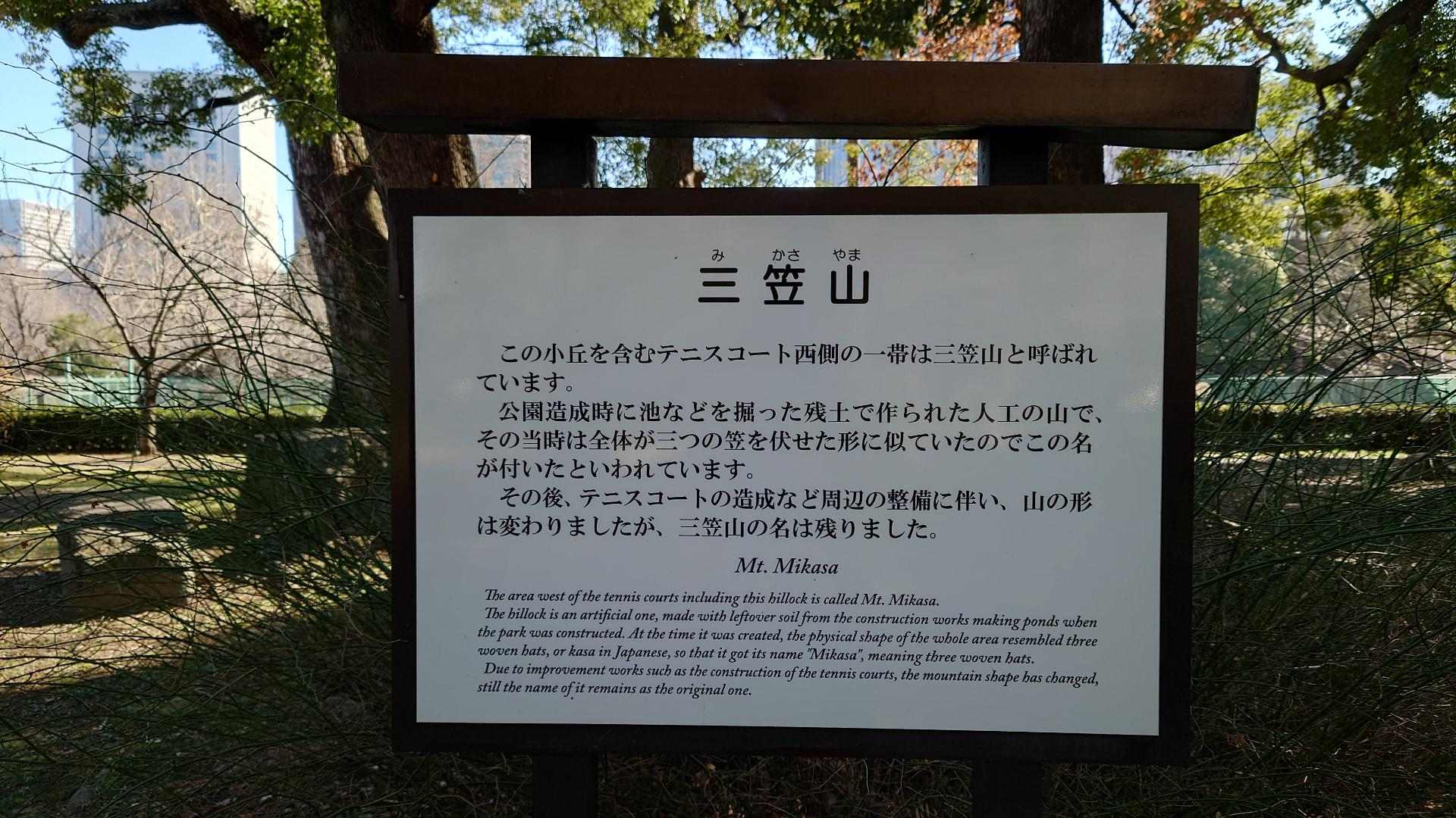 似乎是當初在建造公園時,用那些挖出來的土做成人造山,而人造山看起來像三個斗笠的形狀,所以命名為三笠山。