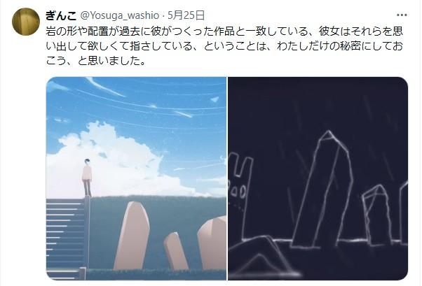 丘の下に小さな家があります。そこに大人になった僕と、誰かが住んでいます。五月の昼下がりに、僕たちはキッチンに立っていて、近くの窓からは黄色の実が成ったびわの木が覗きます。窓を開けているから、きっと良い香りがすることでしょう。僕はびわの香りは知りませんが、きっと甘い蜜のような香りです。僕たちは幸せな時間に包まれています。ですが、僕は幸せには終わりがあることを知っています。たとえ心の別れがなくとも、肉体的な別れがいずれ来ます。永遠には続かない幸せです。