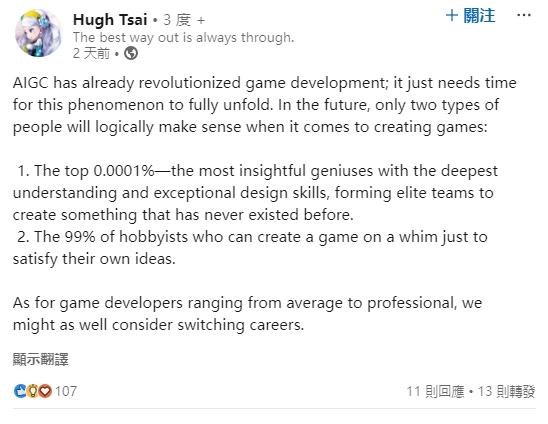 曾推出《原神》、《崩壞:星穹鐵道》等知名作品的中國遊戲公司米哈遊創辦人蔡浩宇(Hugh Tsai)近日在個人 LinkedIn 發表文章,指出 AIGC(Artificial Intelligence Generated Content,自動化生成全新、原創內容 AI 技術)已徹底革新了遊戲開發,僅需要一些時間才能完全拓展這樣的現象。而在未來,僅有兩種類型的人才能合理的創造遊戲。