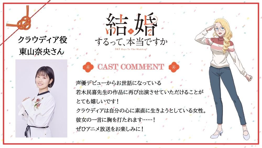由若木民喜所著作品改編,電視動畫《聽說你們要結婚!?(結婚するって、本当ですか)》,官方於14日釋出新視覺圖與第三支宣傳影片以及追加聲優名單,預計2024年10月3日開播。《聽說你們要結婚!?》主角是都不擅長與人交往、住在首都圈內的上班族大原拓也與本城寺莉香,收留了一隻流浪貓的拓也跟喜歡研究地圖的莉香,各自都過著屬於自己的幸福生活……。因應嚴峻的疫情,兩人工作的旅行社決定到西伯利亞駐點,而公司上層決定外派的人選會優先從單身者之中選出。為了不要被流放到寒冷遙遠的西伯利亞,為了守護最心愛的單身日常生活,兩人決定要假裝結婚。然而結婚的消息傳到同事耳中之後,大家的祝福與發問反而成了巨大的壓力以及破綻。所以莉香再次提議要與拓也一起編造愛情經歷,假造兩人真的是情侶的證據。於是他們開始像一般情侶一樣約會、半同居,他們的心境又會出現怎樣的變化呢?