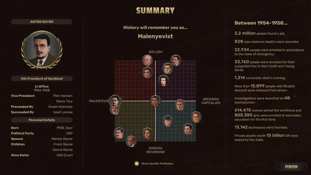 個人建議初次遊玩的時候,不需要去找任何攻略,憑著既有直覺去做決策,最後遊戲除了主角結局的文字敘述,還會給出玩家任期在政治光譜指南針的位置,相當於一個有實際情境,長達十多小時遊戲時間的政治意識型態實踐測驗。玩家能夠從中體會自己樸素的常識與政治信念在有限資源以及複雜的極端環境會如何,感受政治理念和政治實踐之間的差距與各種未預期的後果。