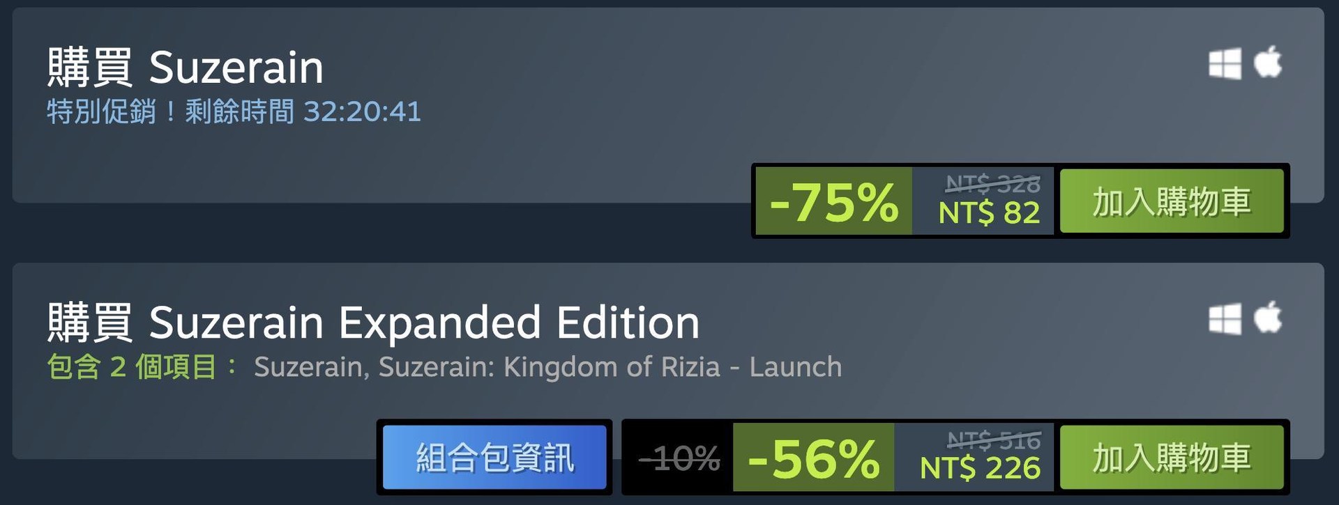 在steam平台,Windows/Mac、Switch、Android/iOS所有平台都有上架,遊戲定價在200-300臺幣左右,近年還出了額外DLC Suzerain Riza,比較可惜的是目前還沒有任何漢化,目前只有英文內容。