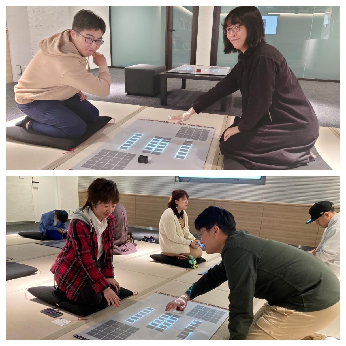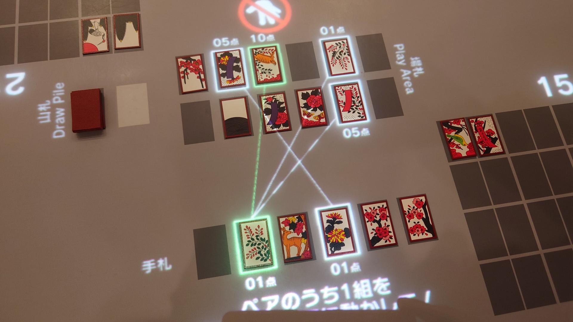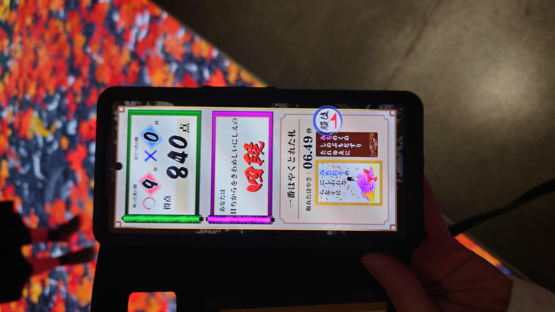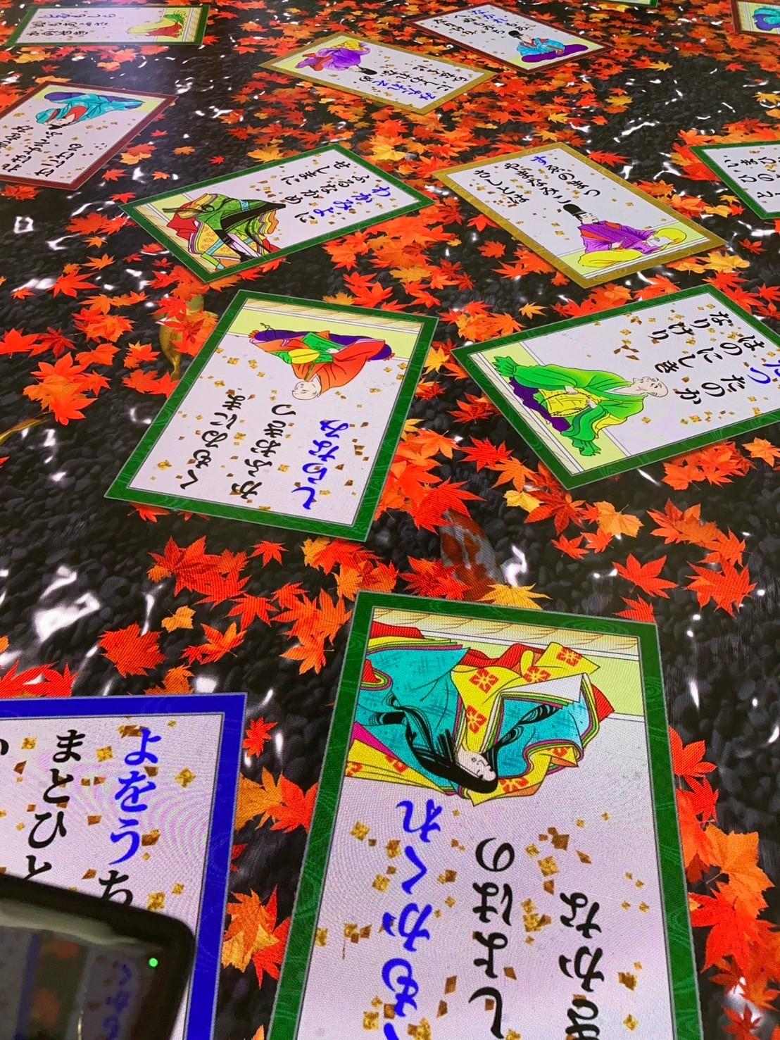 在遊戲場域中,運用投影在地上映出許多張歌牌,玩家使用官方提供的手機進行遊戲。