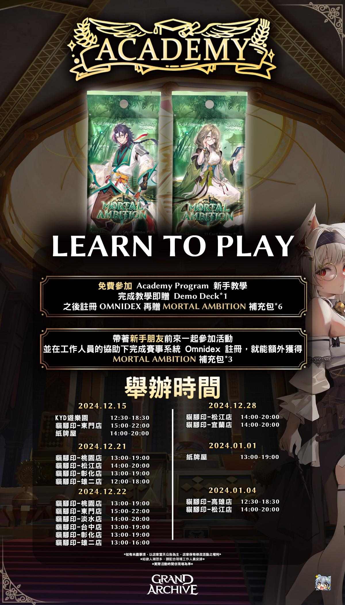 現在,《Grand Archive Academy》全台啟航!北、中、南各地將舉辦免費新手體驗活動,帶你快速入門,一同踏上這場全新的卡牌冒險!