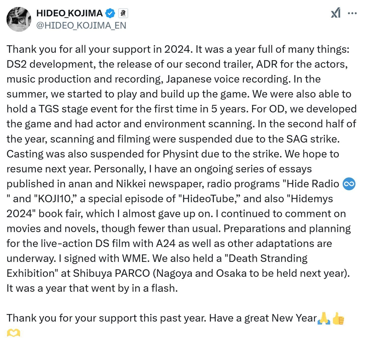 最近,小島秀夫,小島神終於有新 update,他在新一年問候中提及死亡擱淺2的開發,無論是在 TRAILER、角色的配音或展示會的準備,進度也相當良好。