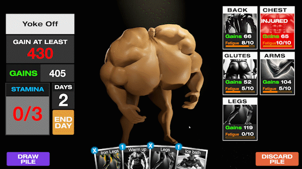 玩家需同時管理五個鍛鍊部位:背(Back)、臀(Glutes)、胸(Chest)、腿(Legs)、手臂(Arms),不同部位的鍛鍊卡牌有專屬的體力消耗與疲勞效果。每個部位的疲勞值若超過10,將導致受傷,無法再進行該部位鍛鍊,需透過休息或卡牌效果恢復。