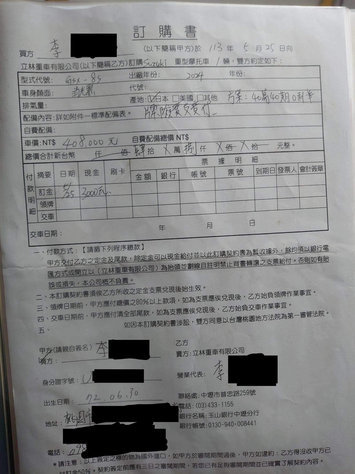 分期的相關事項手續流程等雜項,也在當天完成,本來以為要等個兩三天,想不到這麼神速!接著就是等待業務的通知牽車。另外,我買的是24年款的,價格是41.8萬。