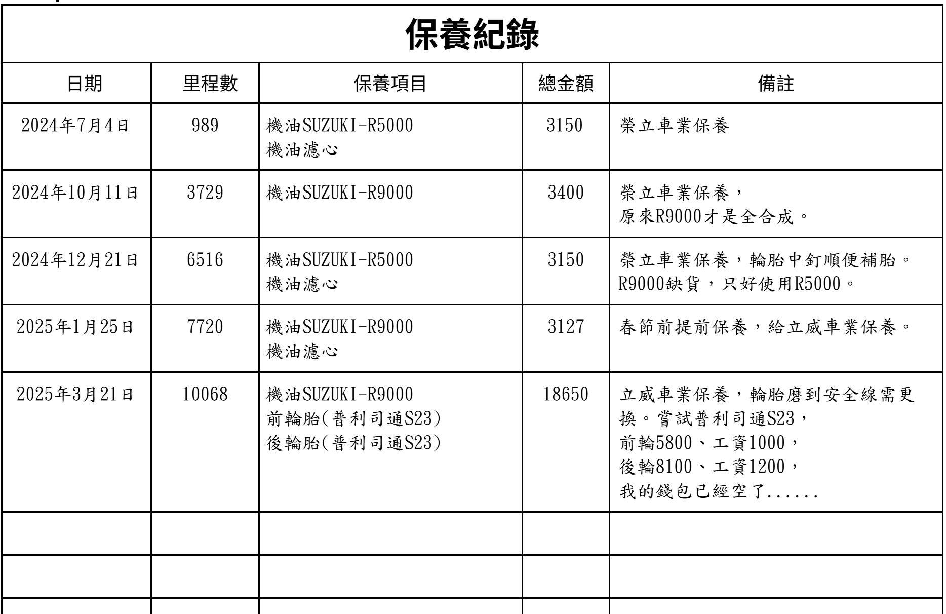 再來是保養,新車磨合1000公里換機油換濾心,3000公里換機油,之後每3000公里換機油,每換兩次機油時濾心在更換。