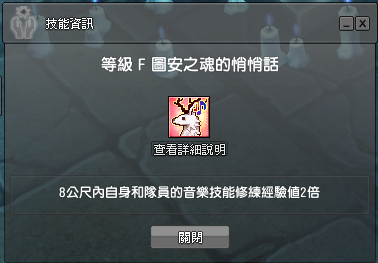 在音樂結束前的30秒內召喚圖安,會得到一個臨時的buff狀態。當音樂結束後,延長音樂效果時間為三倍,並在隊伍處標註(圖安之歌)