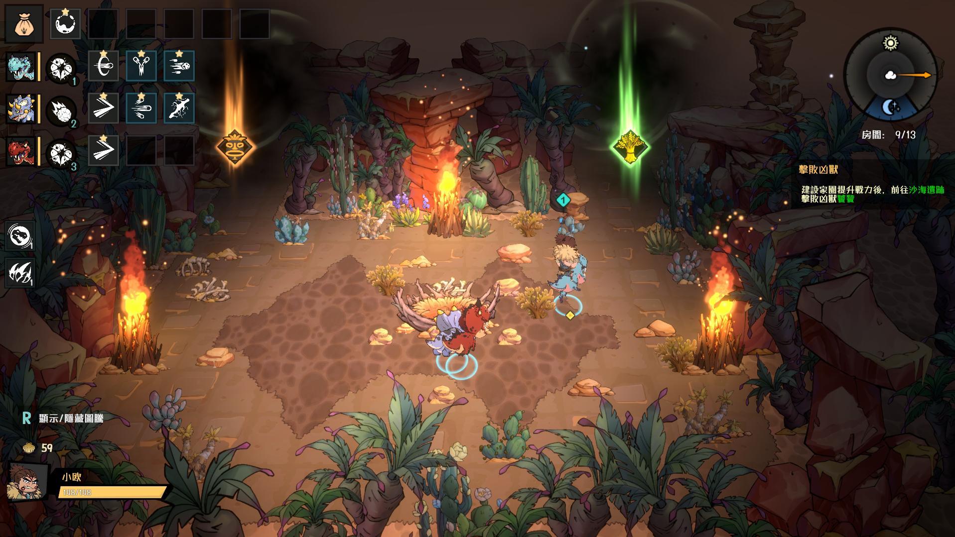 當我們進入探險之後,整場冒險將會被拆分成諸多小型關卡,每當通過一個小關卡,就可以從數個小門當中,自行挑選想要進入的下個關卡;其中的關卡除了有著能夠強化恐龍攻擊的圖騰與遺物之外,也可能會出現擁有珍奇恐龍蛋的蛋房,或是可以在裡面進行買賣和圖騰合成的商店房。