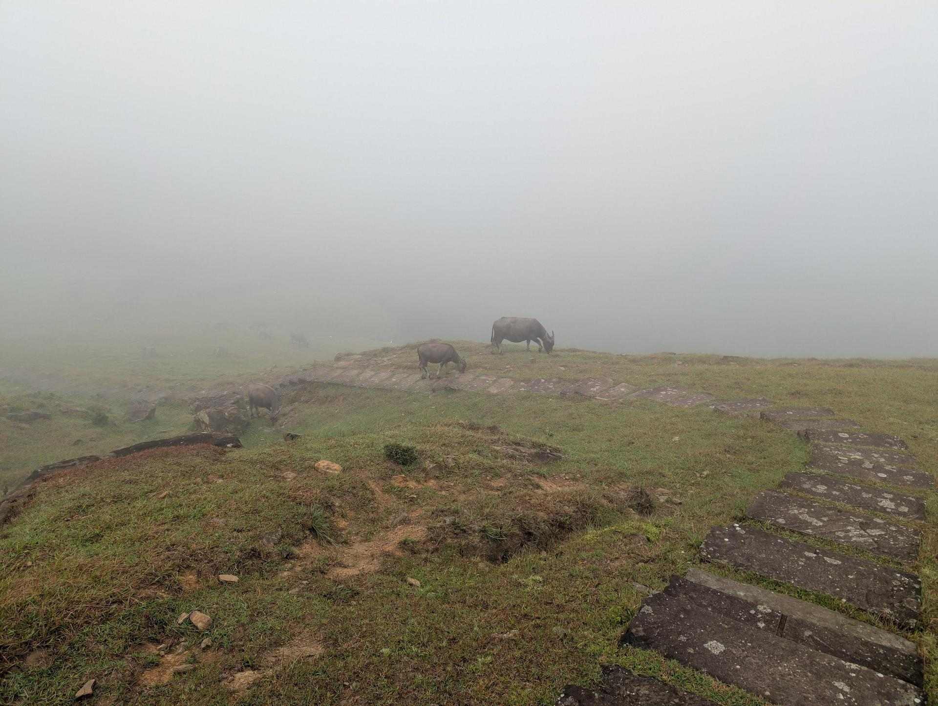 往上走風就大,霧氣也重,也遇到牛群。
